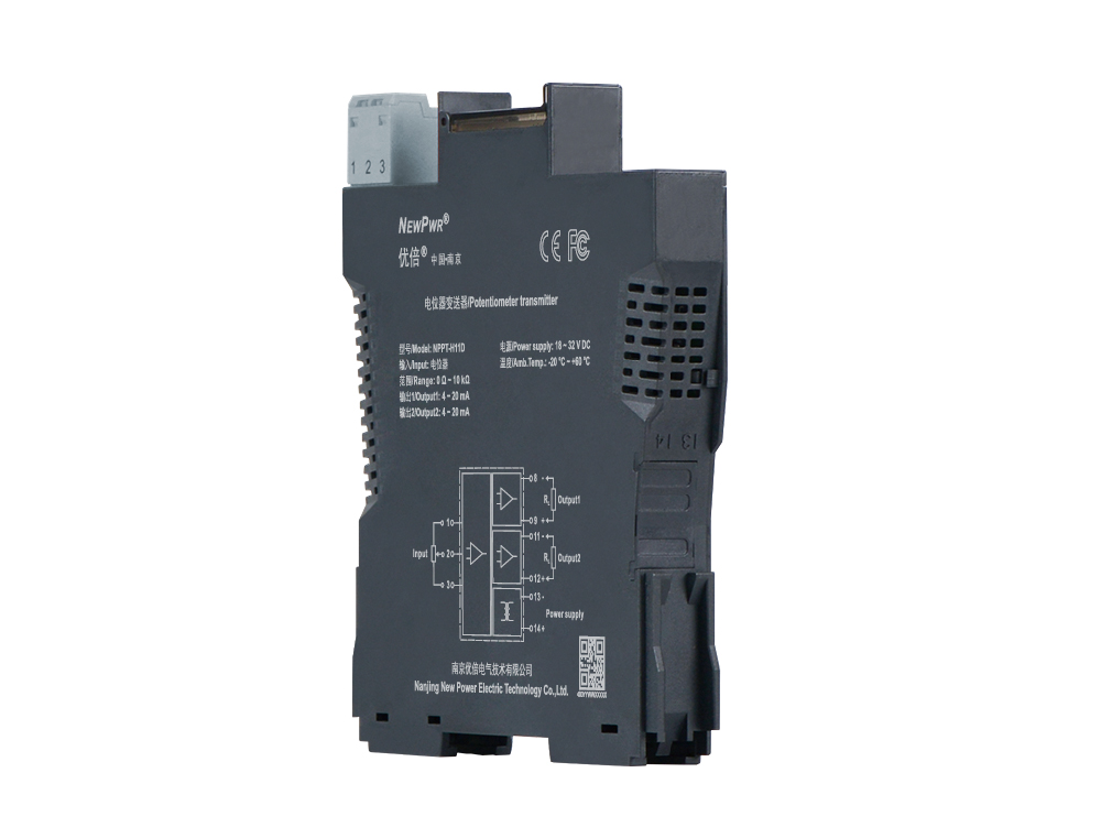 This potentiometer transmitter converts the 3-wire potentiometer signals to 4~20mA signals. It needs a backplane power supply. The input, output, and power supply are galvanically isolated from each other. Calibrate the apparatus or modify parameters by using a handheld programmer.