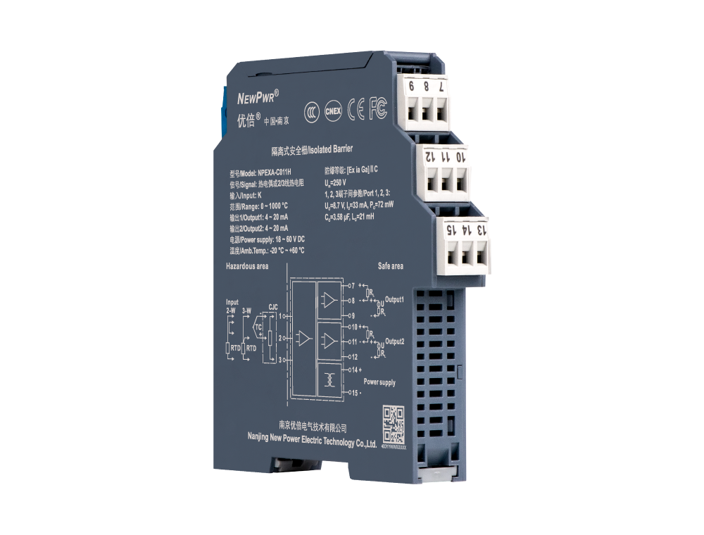 Temperature input isolated barrier, it converts the thermocouple/thermal resistance signals from a hazardous area into 4~20mA signals to a safe area by isolation. It has external cold junction compensation terminals. It needs an independent power supply. The input, output, and power supply are galvanically isolated from each other. The self-test function is also available on this device. Calibrate the apparatus or modify parameters by using a handheld programmer.nt power supply.
