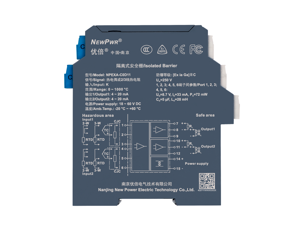 Temperature input isolated barrier, it converts the thermocouple/thermal resistance signals from a hazardous area into 4~20mA signals to a safe area by isolation. It has external cold junction compensation terminals. It needs an independent power supply. The input, output, and power supply are galvanically isolated from each other. The self-test function is also available on this device. Calibrate the apparatus or modify parameters by using a handheld programmer.ation terminals. It needs an independent power supply.