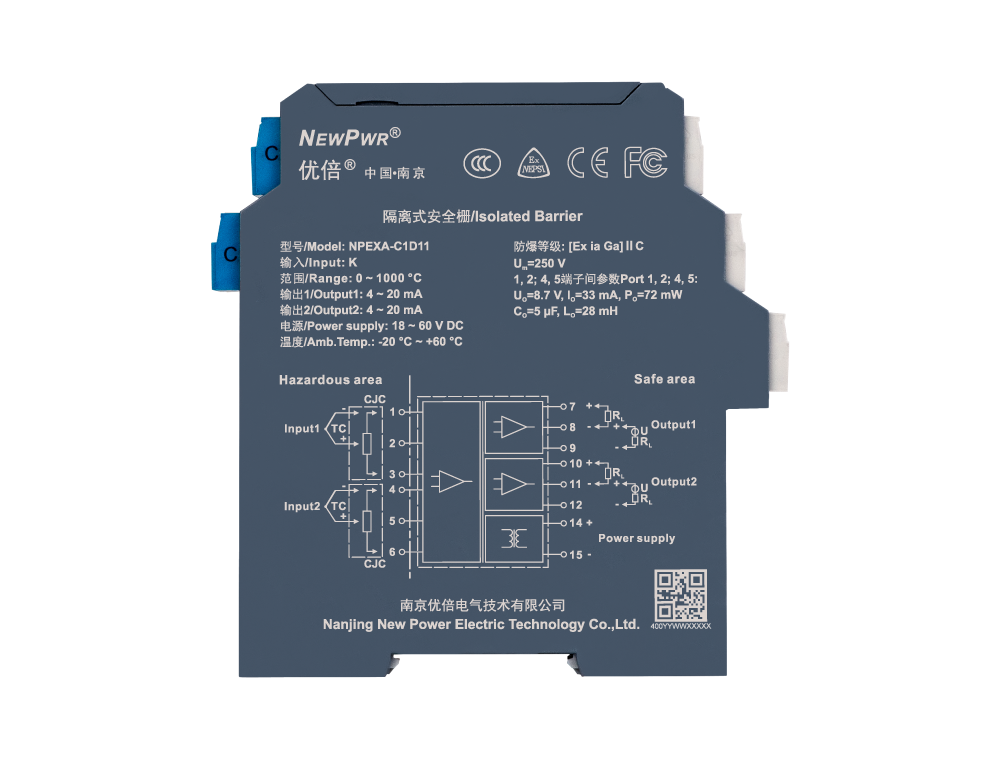Temperature input isolated barrier, it converts the thermocouple signals from a hazardous area into 4~20mA signals to a safe area by isolation. It has external cold junction compensation terminals. It needs an independent power supply. The input, output, and power supply are galvanically isolated from each other. The self-test function is also available on this device. Calibrate the apparatus or modify parameters by using a handheld programmer.