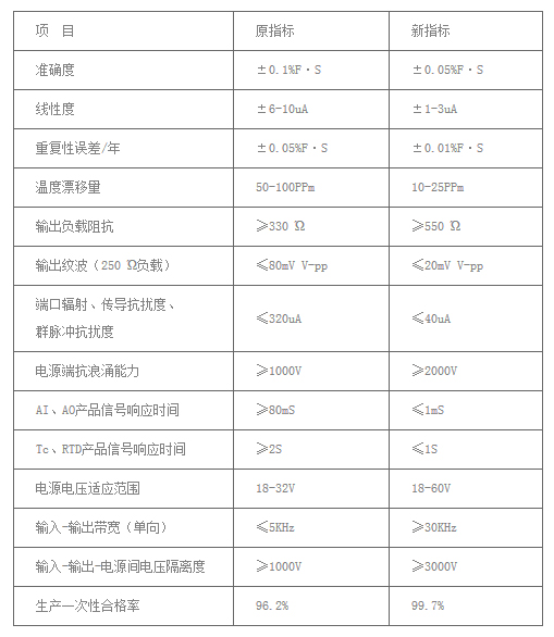 我司研發(fā)、質(zhì)量、生產(chǎn)、工藝、工程等部門充分協(xié)作,在調(diào)研、征求了大量客戶意見、詳細(xì)分析了在海內(nèi)外約260萬只產(chǎn)品的應(yīng)用情況后,以我公司十五年的技術(shù)積累為基礎(chǔ),應(yīng)用了我司多項(xiàng)先進(jìn)、并經(jīng)充分驗(yàn)證的技術(shù)成果,對(duì)接國(guó)內(nèi)、國(guó)際最新技術(shù)標(biāo)準(zhǔn),并引進(jìn)了專業(yè)產(chǎn)品可靠性分析團(tuán)隊(duì),通過數(shù)百次嚴(yán)格試驗(yàn)及研發(fā)后期在各行業(yè)近萬只樣機(jī)的試用,歷經(jīng)數(shù)十次改進(jìn)后,新C系列隔離器、配電器、溫度變送器系列產(chǎn)品最終得以成功定型,其中申請(qǐng)發(fā)明、實(shí)用新型專利十余項(xiàng)、軟件著作權(quán)三項(xiàng)。新C系列產(chǎn)品的各項(xiàng)重要技術(shù)、可靠性等指標(biāo)較老產(chǎn)品有了質(zhì)的提升(見下表)。