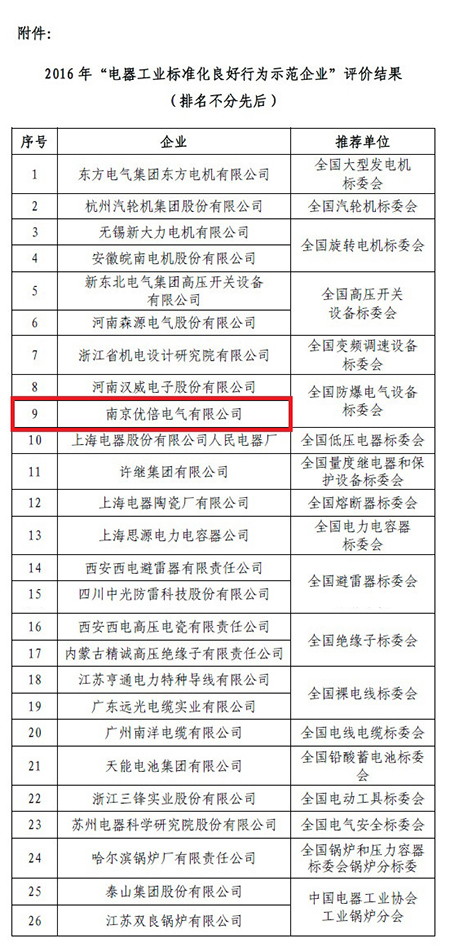 南京優倍電氣有限公司憑借在積極推動和參與國家標準制定、標準執行與實施、企業發展等方面所做出的貢獻及取得的成果,被評定為“電器工業標準化良好行為示范企業”,與上海電氣、許繼集團、四川中光等著名企業共同載譽。