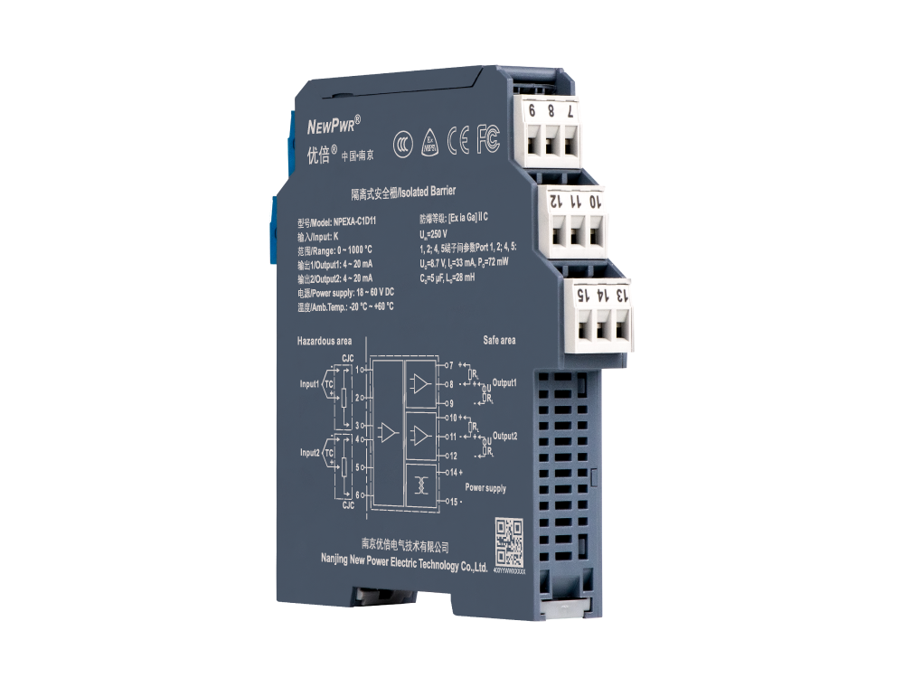熱電偶輸入安全柵,將危險區的熱電偶信號,經隔離轉換為4~20mA電流信號輸出到安全區(其他輸出信號類型產品,具體型號見型譜),外置冷端補償端子。該產品需要獨立供電,輸入、輸出和電源三端隔離,具有在線故障自診斷功能,可以通過PC端或手持編程器對電偶類型、溫度量程等進行組態設置。